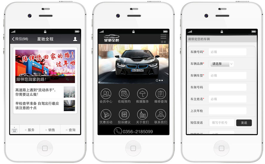 本項(xiàng)目基于騰訊的微信平臺(tái),除實(shí)現(xiàn)了常規(guī)第三方公眾平臺(tái)具有的自定義互動(dòng)導(dǎo)航菜單、關(guān)健詞應(yīng)答、微網(wǎng)站、微商城預(yù)訂、微信支付、微信會(huì)員卡、營(yíng)銷(xiāo)活動(dòng)、微信游戲等功能外,項(xiàng)目最大的亮點(diǎn)是通過(guò)定制開(kāi)發(fā)實(shí)現(xiàn)了與目前星馳全程內(nèi)部業(yè)務(wù)系統(tǒng)進(jìn)行數(shù)據(jù)交互,在線提供實(shí)時(shí)的積分查詢、積分兌換、車(chē)輛維修進(jìn)度查詢、保險(xiǎn)到期查詢、保養(yǎng)狀態(tài)查詢等功能。